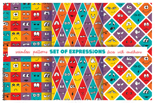 Set of 3 expression faces seamless vector patterns. Different emotion of faces, eyes, mouths. Print for wallpaper, scrap booking, wrap paper, textile, greeting car, party decoration, note cover.