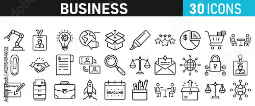 Set of 30 Business icons. Business web icons in line style. Money, bank, contact, infographic, balance. Icon collection. Vector illustration.