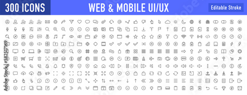 Set of 300 Interface ui, ux web icons in line style. User, profile, message, mobile app, document file, social media, button, home, chat, arrow, collection. Vector illustration.
