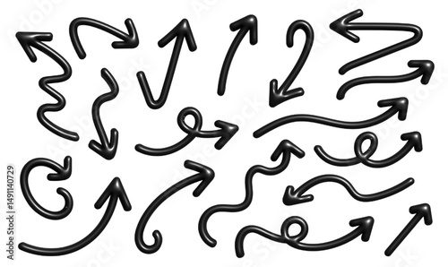 Set of 3D Curly Arrows Icon Collection Glossy Black Wavy Directional Symbols with Transparent Background set of black and white arrows