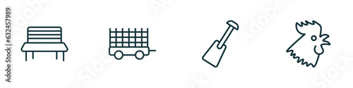 set of 4 linear icons from agriculture farming concept. outline icons included garden bench, farm trailer, digging bar, rooster vector