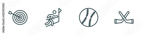 set of 4 linear icons from sport concept. outline icons included dartboard and dart, winning the race, baseball, hockey vector