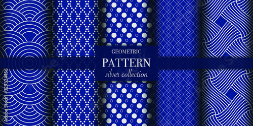 Set of 5 dark blue and silver luxury geometric pattern background. Abstract line, dot retro style vector illustration for wallpaper, flyer, cover, design template. minimalistic ornament, backdrop.