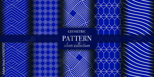 Set of 5 silver luxury geometric pattern background texture. Abstract line, dot retro style vector illustration for wallpaper, flyer, cover, design template. Repeat circle ornament, backdrop element
