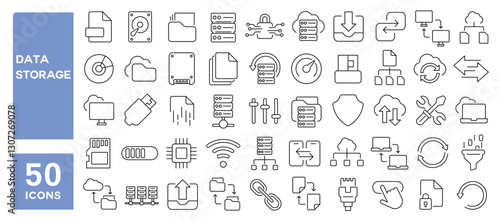 Set of 50 line icons related to data storage, hosting, protection, cloud, computing, database, storage, server, system, file, transfer, recovery, memory, drive, Editable stroke. Vector illustration