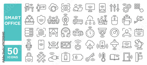 Set of 50 line icons related to smart office, devices, technology, electronics, work, wireless, employees, network, workspace, Editable stroke. Vector illustration
