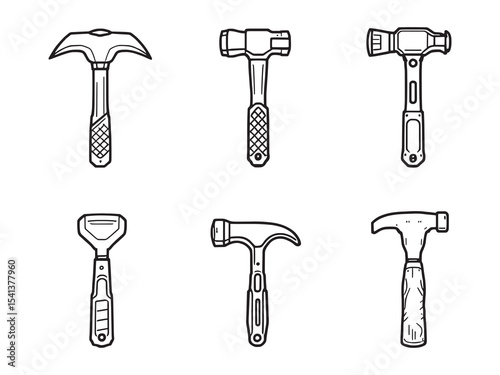 set of 6 psc different type of Emergency hammer clear vision simple dark black line art on white.eps