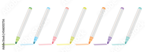 set of 7 highlighter marker pens for highlighting text in pink, yellow, green, blue, purple, orange and teal isolated on white background. Colorful sharpies vector illustrations.