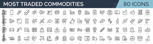 Set of 80 outline icons related to most traded commodities, global trade. Linear icon collection. Editable stroke. Vector illustration