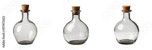 Set of A clear glass bottle with a cork stopper on transparent png background
