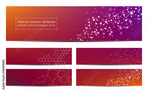 Set of abstract banner design, dna molecule structure background. Geometric graphics and connected lines with dots. Scientific and technological concept, vector illustration.