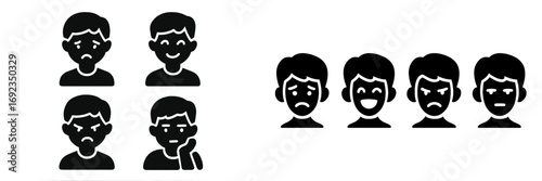 Set of black glyph icons depicting a boy's face with various emotional expressions like happy, sad, angry, and bored for user interface design and mental health concepts
