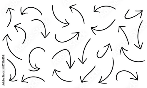 Set of black hand drawn grunge doodle spiral and curved charcoal, chalk arrows on white background. Scribble symbols of direction pointers, swirl arrow elements for infographic design in eps 10.