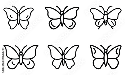 Set of black outline vector icons featuring butterfly designs in different styles, ideal for nature, wildlife, decoration, and minimalist design projects.
