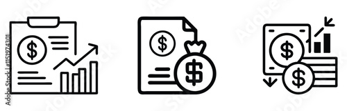 Set of black outline vector icons featuring financial reports, money symbols, and graphs, ideal for business, investment, and economic analysis themes.