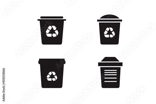 Set of black recycling and trash bin icons; perfect for eco-friendly, waste management, sustainability, sorting, and environmental awareness designs or projects