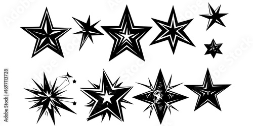 Set of black star icons and starburst shapes on white background. Collection of various decorative stars in different outlines and fills. Geometric celestial illustration elements.