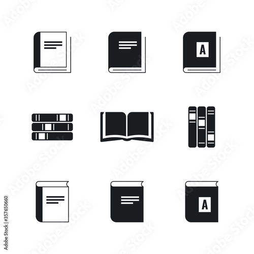 Set of book icons in single color. Simple images open book and different covers. To illustrate education, reading, library. Isolated illustration on white background. Flat style. Vector stock image