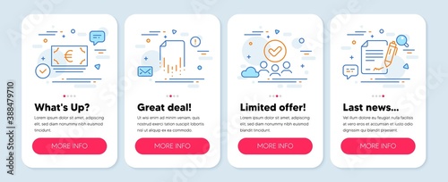 Set of Business icons, such as Recovery file, Approved group, Euro currency symbols. Mobile screen banners. Signing document line icons. Backup document, Teamwork, Eur banking. Contract. Vector