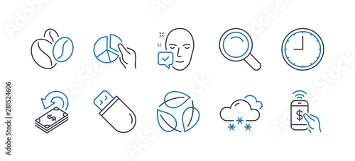 Set of Business icons, such as Search, Snow weather, Pie chart, Cashback, Leaves, Coffee beans, Time, Face accepted, Usb stick, Phone payment line icons. Magnifying glass, Snowflake. Vector