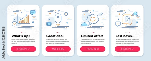 Set of Business icons, such as Smile, Scroll down, Graph chart symbols. Mobile screen mockup banners. Parking line icons. Comic chat, Mouse swipe, Growth report. Auto park. Smile icons. Vector