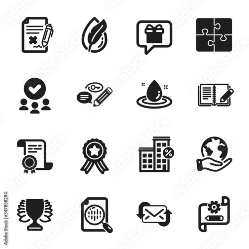 Set of Business icons, such as Winner, Fuel energy. Certificate, approved group, save planet. Analytics chart, Wish list, Feedback. Loan house, Cogwheel blueprint, Puzzle. Vector