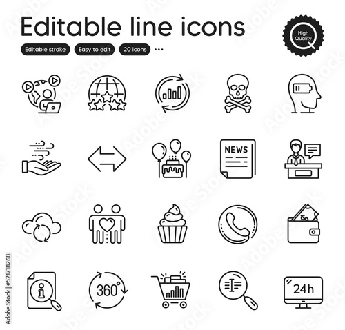 Set of Business outline icons. Contains icons as Sync, 360 degree and Seo shopping elements. Chemical hazard, Call center, Cake web signs. Search text, 24h service, Video conference elements. Vector