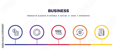 set of business thin line icons. business outline icons with infographic template. linear icons such as dollar coins stack, pie chart statistics, empty box, money convert, newspaper page vector.