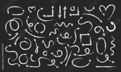 Set of charcoal hand drawn doodle spiral and curved arrows. Vector scribbles with the texture charcoal, chalk of wax crayon on black background.
