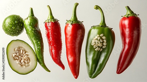 Set of chili peppers including bright red and green varieties floating in the air isolated against a clean white background