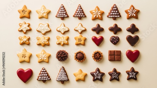 Set of Christmas cookies in festive shapes like stars, trees, and hearts, arranged neatly on a light-colored background.