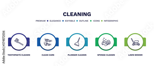 set of cleaning thin line icons. cleaning outline icons with infographic template. linear icons such as toothpaste cleanin, clean cars, plunger cleanin, sponge cleanin, lawn mower vector.