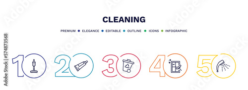 set of cleaning thin line icons. cleaning outline icons with infographic template. linear icons such as vacuum, toothpaste, wiping trash container, clean window, shower vector.