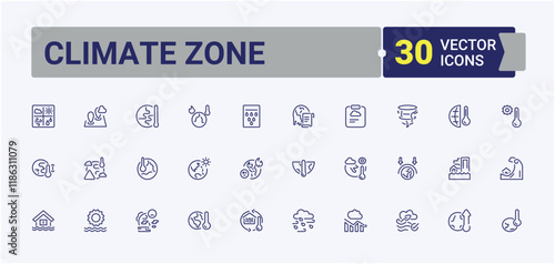 Set of Climate Zone line icons. Containing wind, storm, snow, decrease, duct, weather, planet, green. Minimal linear icons. Vector icons editable stroke.