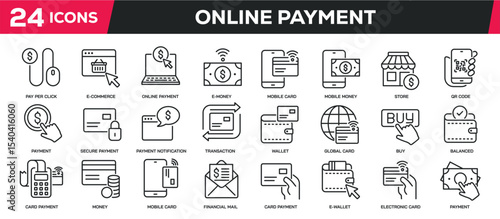 Set of collection line icons related online payment, credit card, cashless. Editable stroke. Perfect pixel on transparent background