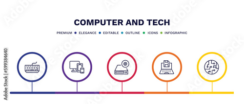 set of computer and tech thin line icons. computer and tech outline icons with infographic template. linear icons such as classroom keyboard, responsive de, dvd drive, save file, chips vector.