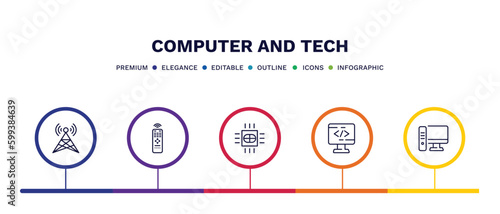 set of computer and tech thin line icons. computer and tech outline icons with infographic template. linear icons such as telecommunications, tv remote, computer micro chip, computing code,