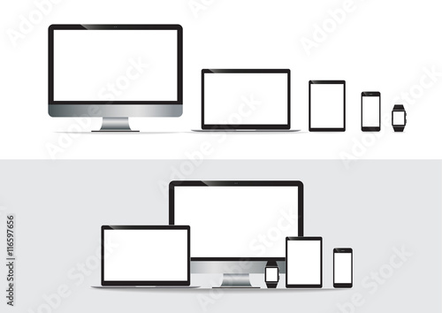 set of computer monitor, laptop, tablet, mobile phones smart phone. Electronic gadget isolated vector illustration