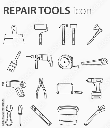 Set of construction tools icons. Outline style. Includes badges such as: drill, screwdriver, pliers, saw, wrench, hammer, putty knife, paint roller, sledge hammer, ax.