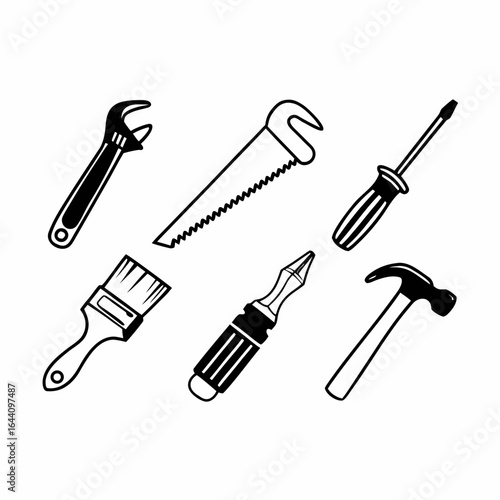 Set of construction tools isolated on white background, including wrench, saw, screwdriver and hammer