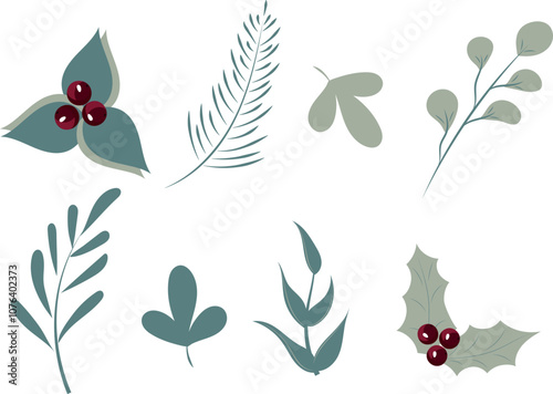 Set of decorative vector winter floral elements. Christmas and new year design kit