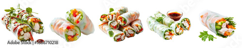 Set of delicious springrolls in rice paper with vegetables and chicken isolated on transparent background PNG