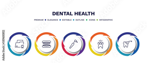set of dental health thin line icons. dental health outline icons with infographic template. linear icons such as dental folder, dentures, dentists drill tool, cavity, tampon vector.