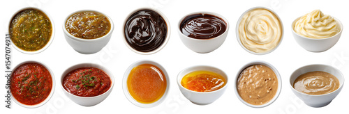 Set of different flavour sauce dip ketchup in white bowl saucer, side top view, on transparent cutout PNG. Honey maple, mayonnaise mayo, Chutney, chocolate, peanut, marinara flavour. Mockup template