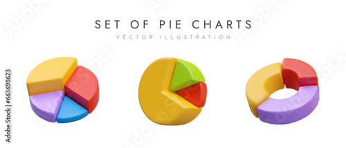 Set of different pie charts. Poster with collection of round diagrams for business management and finance. Vector illustration in yellow, red and purple colors