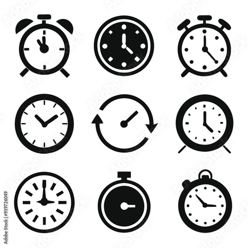 Set of Different Simple Clock Icons Vector Illustrations Featuring Various Clock Designs in a Minimalistic Style on a White Background, Perfect for Time-Related Graphics and User Interface Design