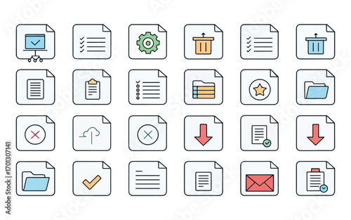 Set of Document File Icons Representing Different Functions and Operations for Computer Software Applications and Online Platforms