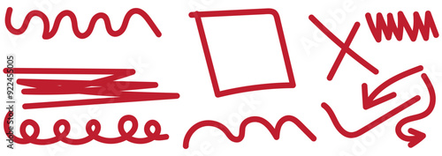 Set of doodle crosses, swirls, broken lines. Hand-drawn geometric shapes. Abstract sketch symbols.