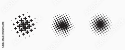Set of dotted abstract shapes. Halftone pattern. Half tone design elements in geometric tech style for logo, banner, web page, print, poster, business cards and template.