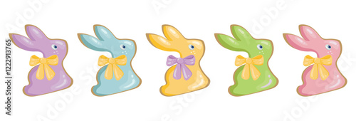 Set of easter bunnies with bows. Spring religious holiday happy easter. Gift in the form of colorful gingerbread bunnies. Vector illustration isolated on white.